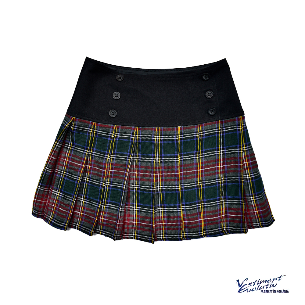 Fustă scurtă plisată, petrecută, în carouri cu bată uni. Se încheie cu nasturi.Avantajează orice tip.....