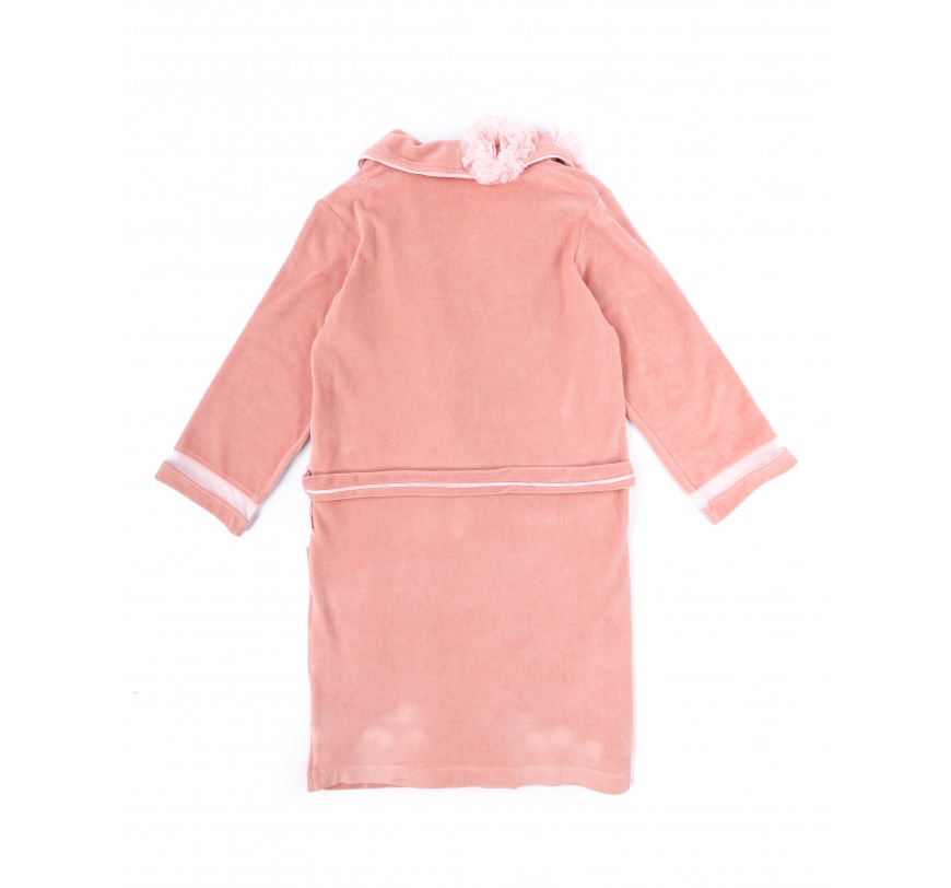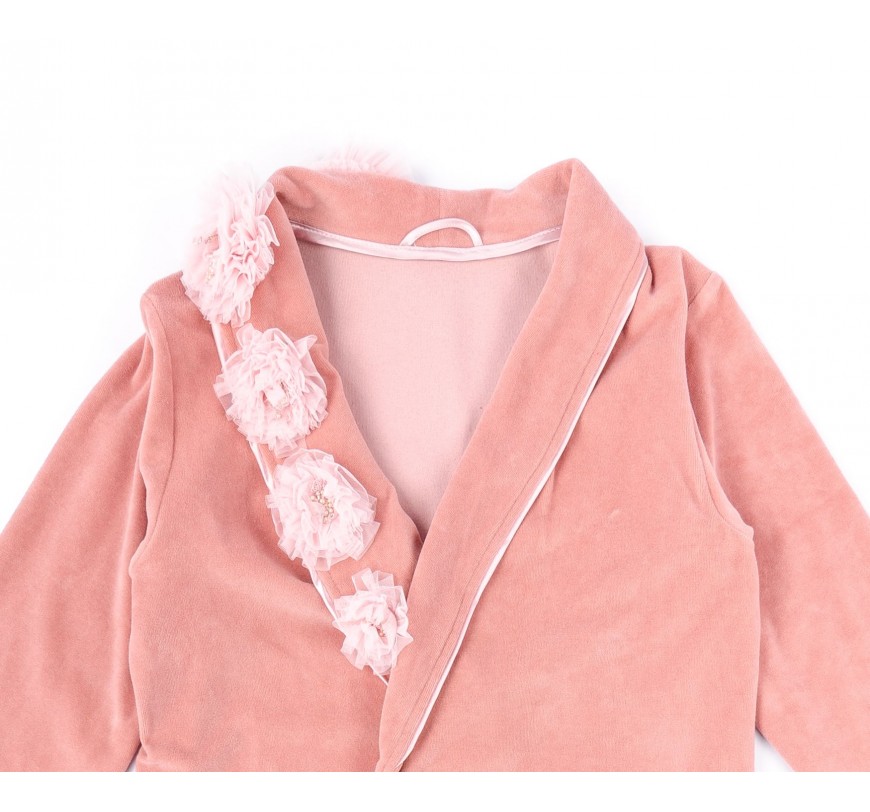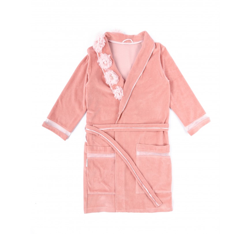 Halat cu 2 buzunare, cu găici în talie şi cordon, detalii romantice pe guler reprezentate de flori din tulle, aplicate.